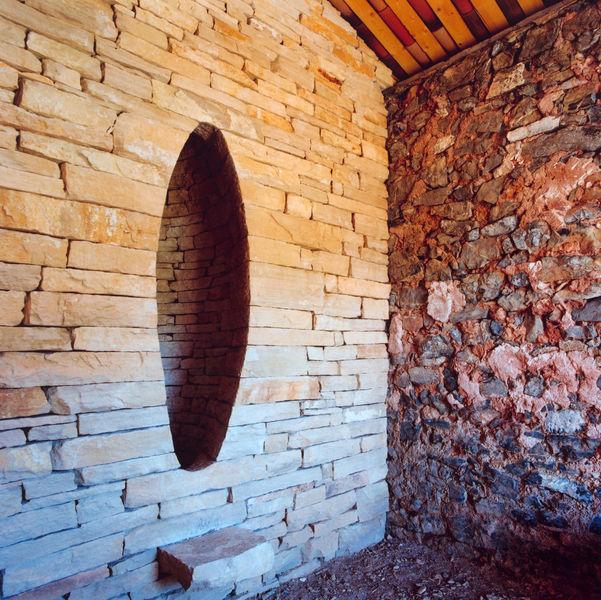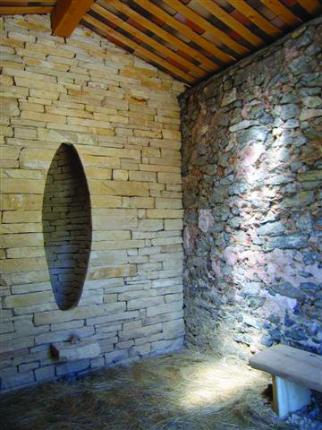 N’hésitez pas à pénétrer à l’intérieur de la chapelle, Andy Goldsworthy** intervient ici sur la totalité du bâtiment. Le mur du fond est doublé d’un appareillage régulier de pierres taillées au centre duquel une cavité en forme d’œuf permet de se tenir debout. C’est là que « d’autres se sont tenues avant, et où d’autres se tiendront après », dit l’artiste. Il conçoit ce dispositif pénétrable comme un écrin qui conserve la mémoire des visiteurs, témoin de leur présence, mais également de leur absence en ce lieu.