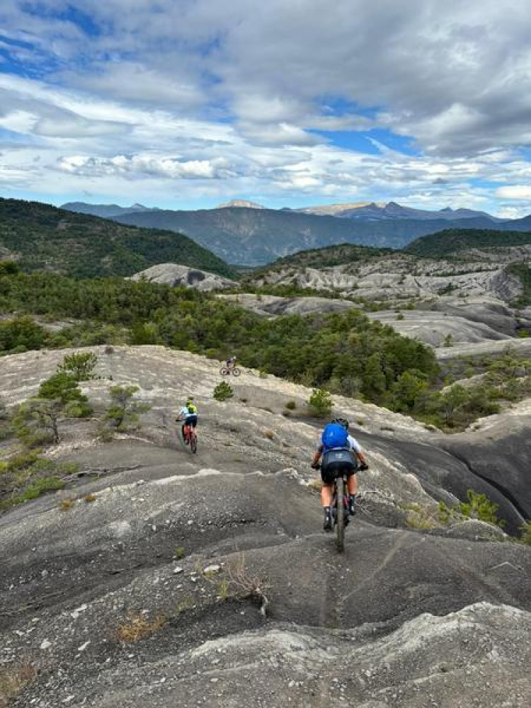 En option : L'entrée VIP (avec prêt de peignoir et serviette) 4h d'accès à l'espace aqualudique du Spa Thermal à Digne-les-Bains : + 27€/pers. Massage suédois 60€/45 min, axé sur le dos et les jambes. L'accompagnateur VTT sur une ou plusieurs journées (devis sur demande).Le prix comprend : Les transferts de personnes avec VTT au point de départ à Verdaches, les transferts de bagages pendant 4 jours. La pension complète en hôtel le premier soir (Le Refuge des Sources), diner sportif (vin et café compris) petit déjeuner continental et pique-nique à récupérer le matin. La pension complète en gîte de séjour (Domaine Les Grandes Mollières) le deuxième soir : diner sportif complet (vin et café compris), petit déjeuner continental et pique-nique à récupérer le matin, nuitée en dortoir, lit individuel ou supplément en chambre d'hôtes (double/twin) : +25€/personne. La demi-pension en hôtel le troisième soir (Hôtel du Lac), petit déjeuner continental et pique-nique à récupérer le matin. Les cartes IGN et descriptifs des parcours, les traces GPX (avec toutes les variantes possibles). Les lavages VTT et les douches à l’arrivée (prévoir produits et serviettes de toilette) dans le cadre des horaires d’ouverture de l’office de tourisme. La taxe de séjour.